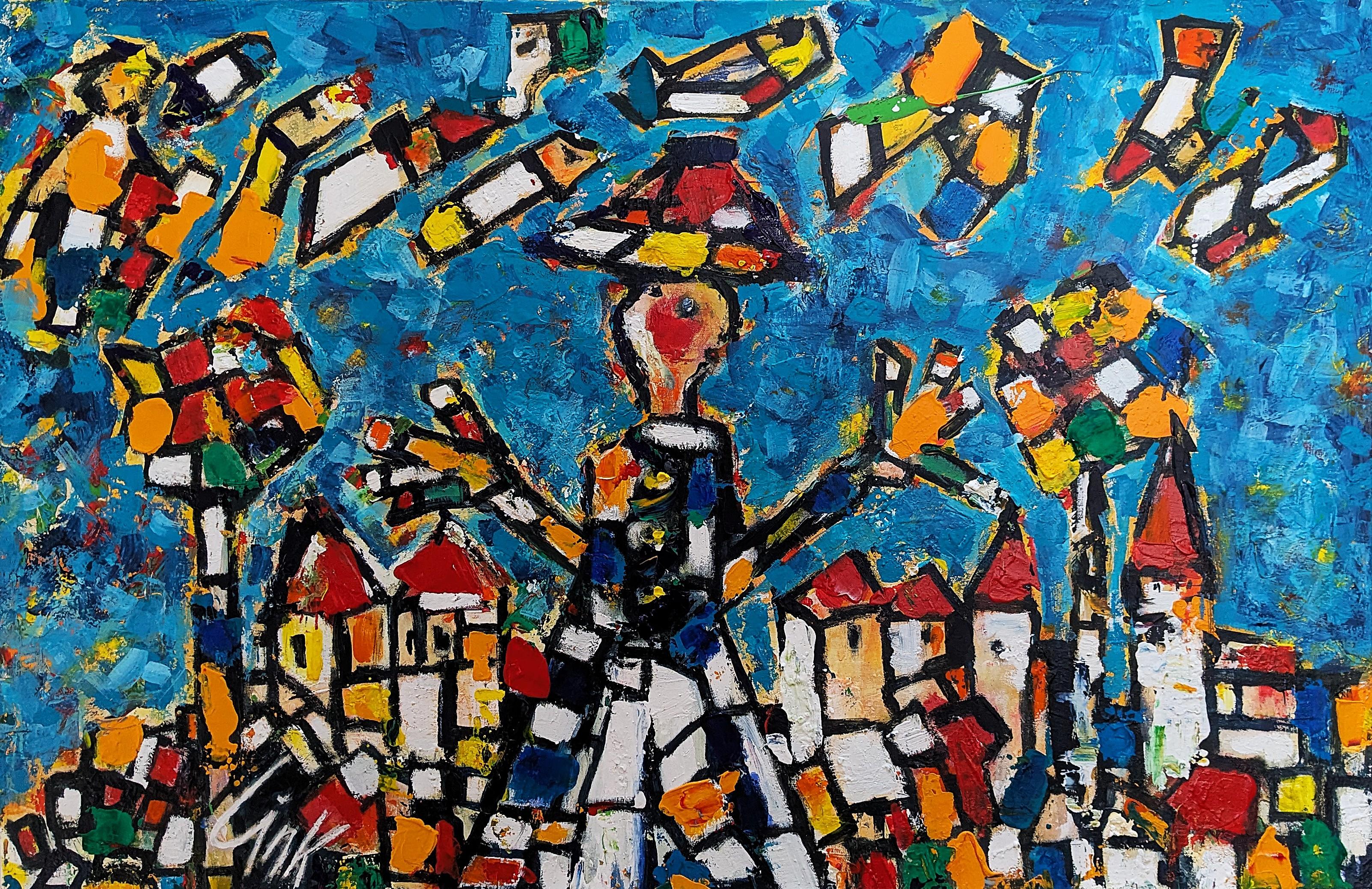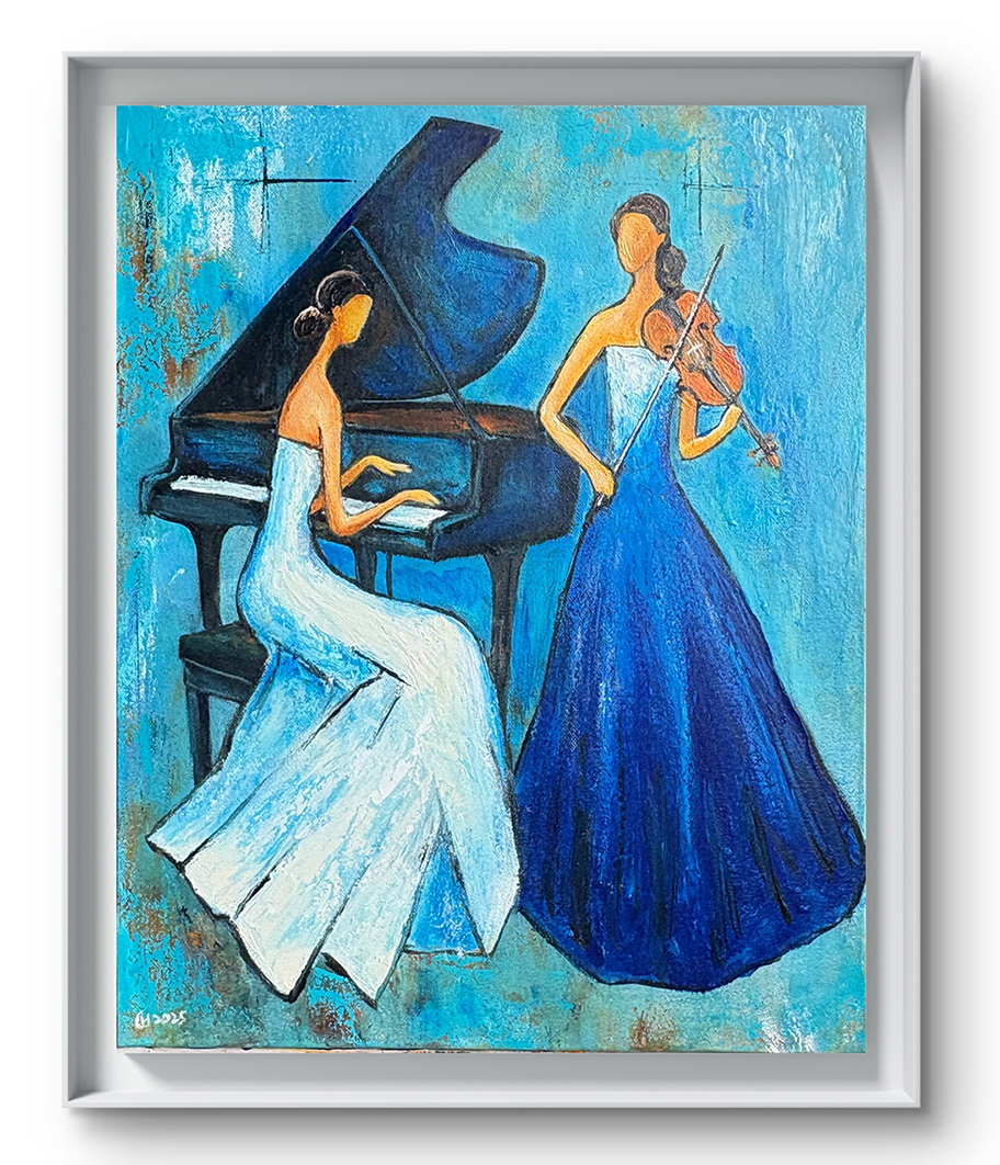 “Sonata Blu” ist eine poetische Hommage an die Harmonie zwischen Musik und Malerei. In einem Meer aus sanften Blau- und Türkistönen begegnen sich zwei Musikerinnen: die Pianistin in ruhiger, fließender Bewegung, die Violinistin in aufrechter, klarer Eleganz. Die Komposition verbindet Stille und Klang – als würde die Leinwand selbst zu einem Konzertsaal werden. Die rhythmischen Pinselstriche, die feinen Lichtakzente und die abstrahierten Figuren schaffen eine Atmosphäre voller Anmut, Konzentration und innerer Resonanz.