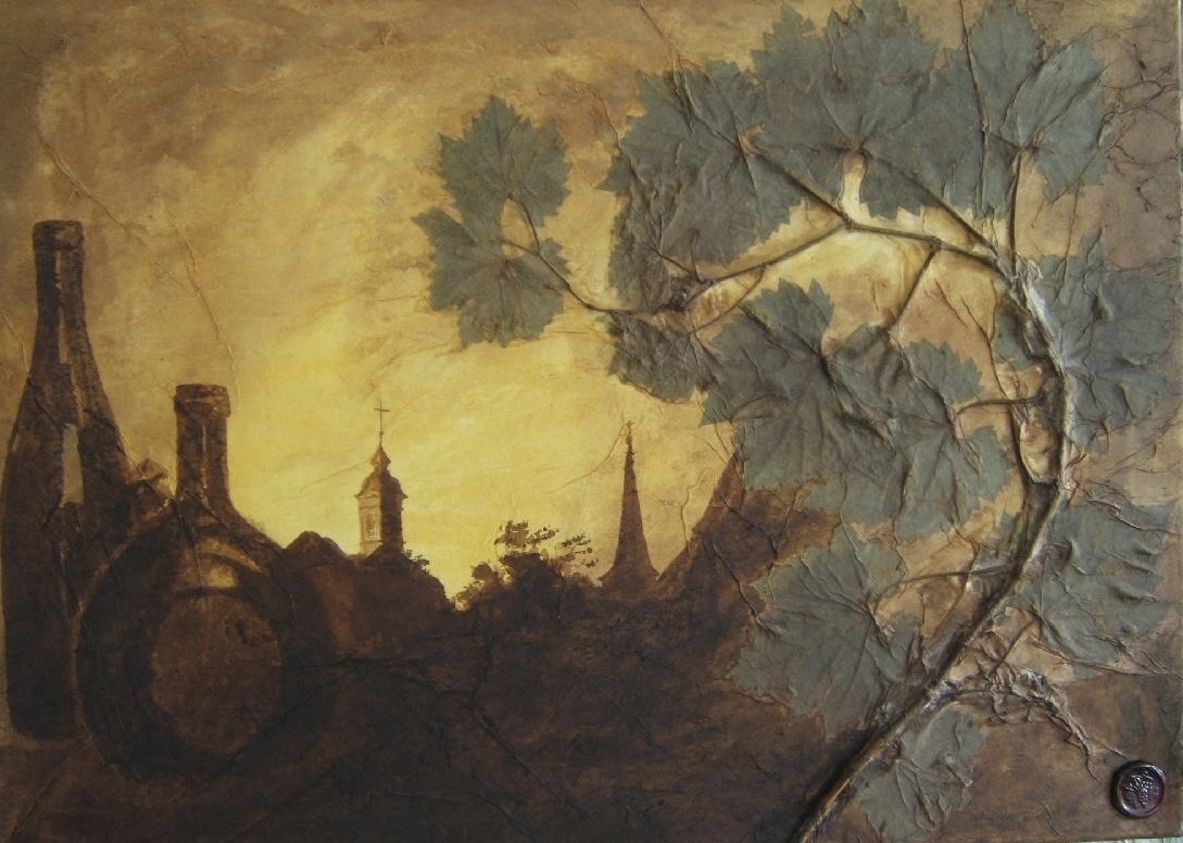 Mischtechnik, Weinlaub überzogen mit Chinapapier, mit übermalt Acryl